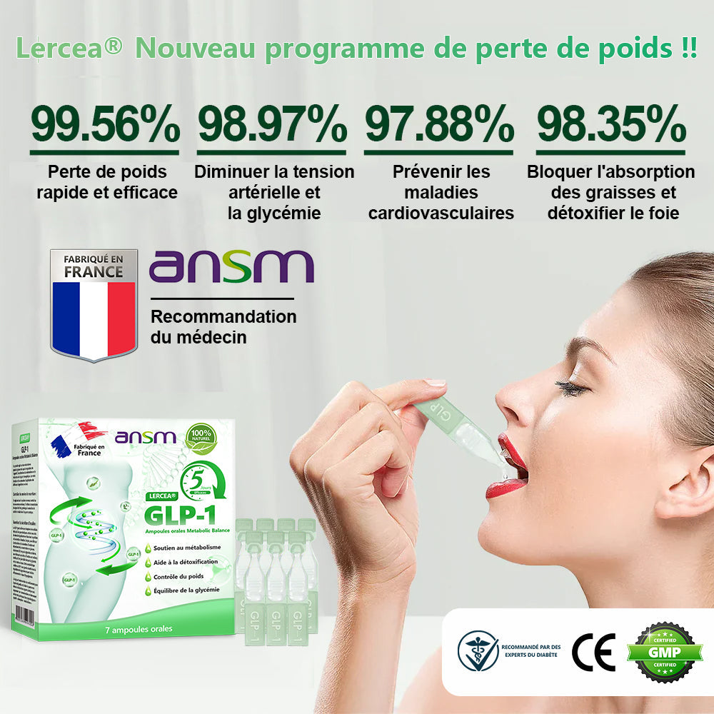 Testée cliniquement par des endocrinologues, 𝐋𝐄𝑹𝑪𝐄𝐀® mpoules Orales Équilibre Métabolique GLP-1 Obésité peut améliorer significativement l'obésité et d'autres problèmes de santé en seulement 7 jours.